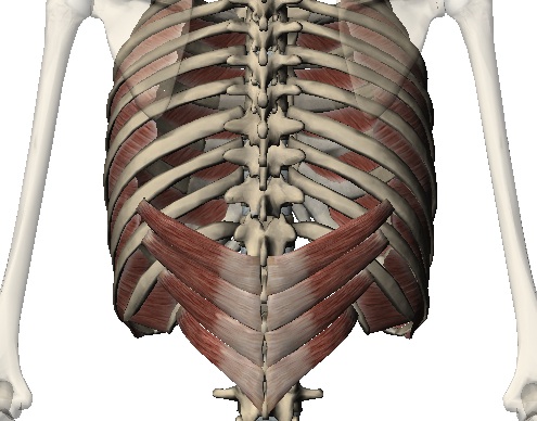 この下後鋸筋(かこうきょきん)が働くと胸郭の下側(下位胸郭)を横に 拡張してくれる作用があります。