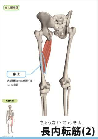 長内転筋は起始部が恥骨結節の下方、停止部が大腿骨後面の粗線内側唇の中3分の1です。