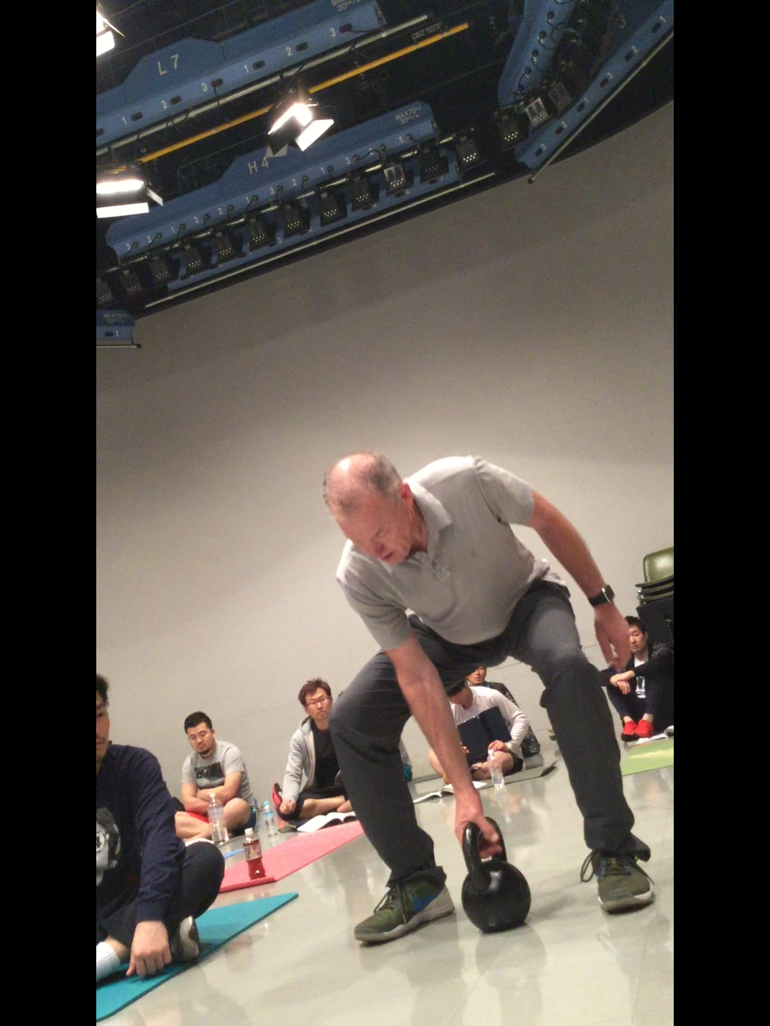 実技の内容も盛りだくさんで、腹斜筋と腰方形筋を活性化させるケトルベルキャリーから始まり、デイフォルとKBキャリー、ブリーミングのアクティブシングルレッグレイズ”コアスクリーン”で腰椎に安定性があるかどうか確認して、ブリッジをしながらサンドバッグを持ちオーバーヘッドのエクササイズを行いコアの安定性を促すものなど、ここでは書ききれないくらい行いました。