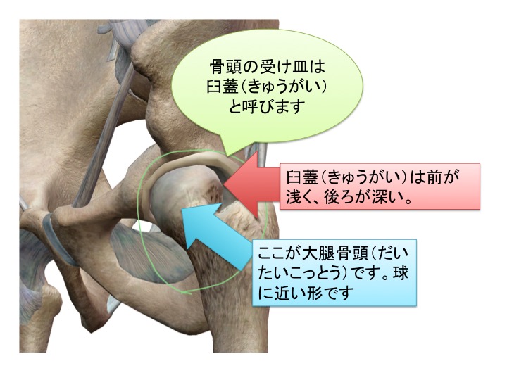 骨盤の臼蓋が受け皿の役割で、大腿骨頭が球の形をしていて、2つで球関節という種類の関節を作っています。