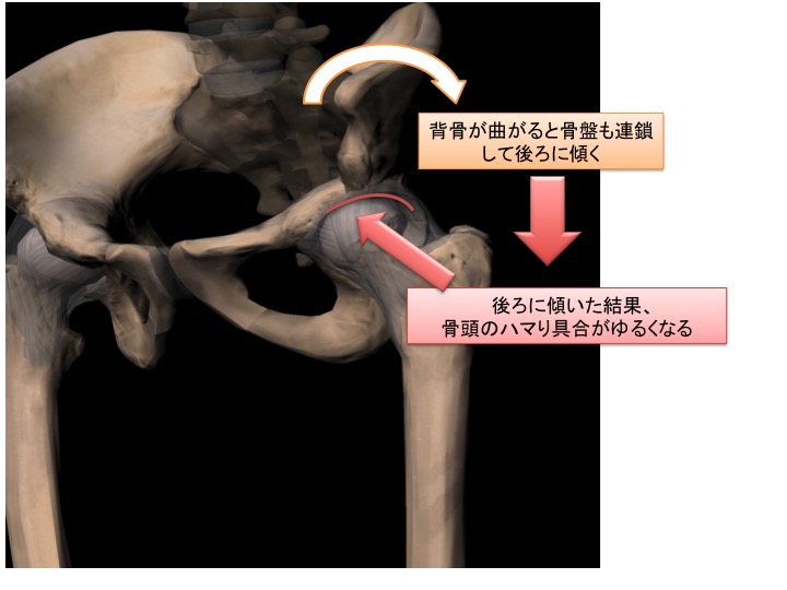 骨盤が後傾位になると骨盤(受け皿)に対して、大腿骨の骨頭の安定度が低下します。