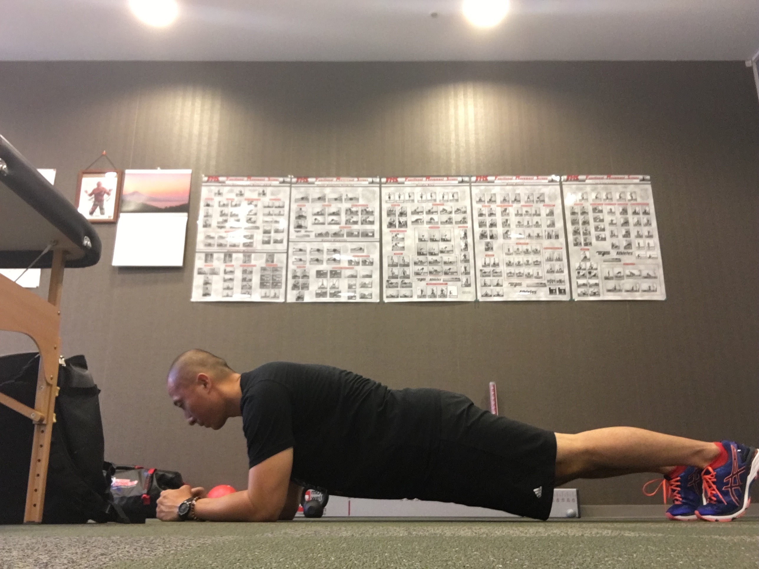 これは肩関節の安定性と、お腹周りの筋肉が同じ長さを保ちながら1分前後耐えるというトレーニングです。