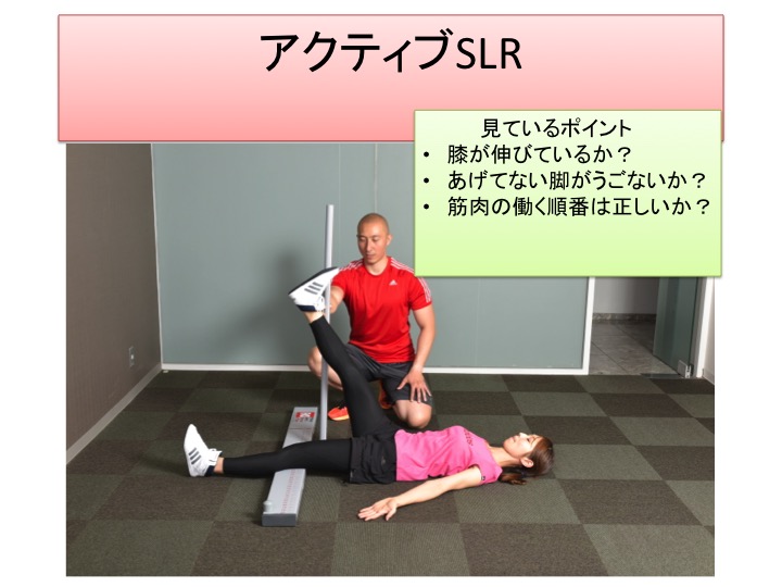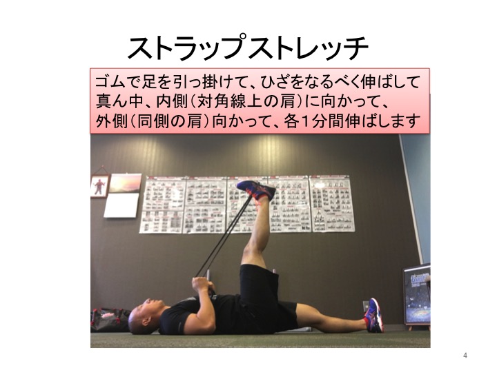 この写真のレッグ・ローワリングという種目は改善したい側の脚を常にあげて、腿裏のブレーキを外して良いのだと脳に知らせる運動です。