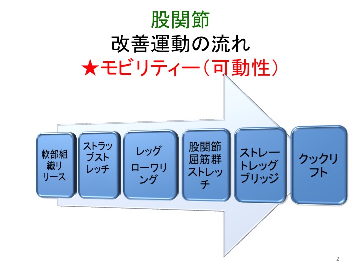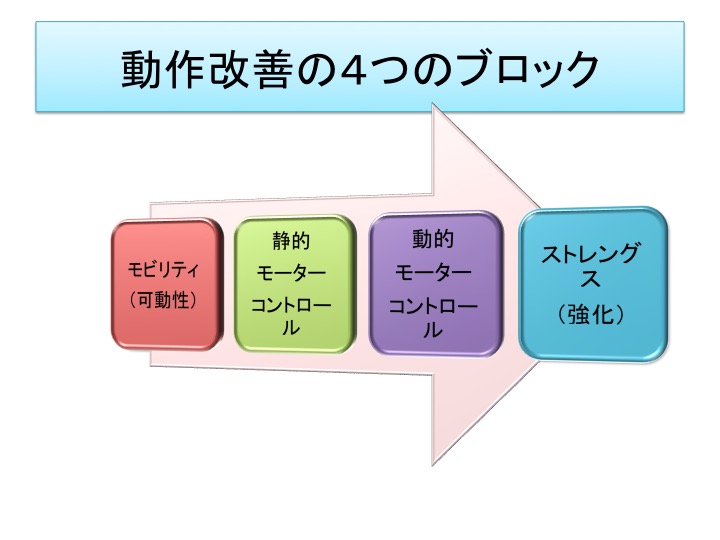 行う手順は①可動性改善(モビリティー)②静的モーターコントロール③動的モーターコントロール④ストレングス(強化)の4ブロックです。