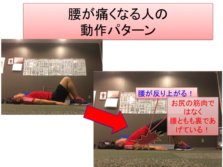 その方々に写真のように両膝を立てて、お尻を上に上げるエクササイズを行っていただくと、股関節の動きよりも腰や腿裏の力を使って、上に向かって高く上げようとします。