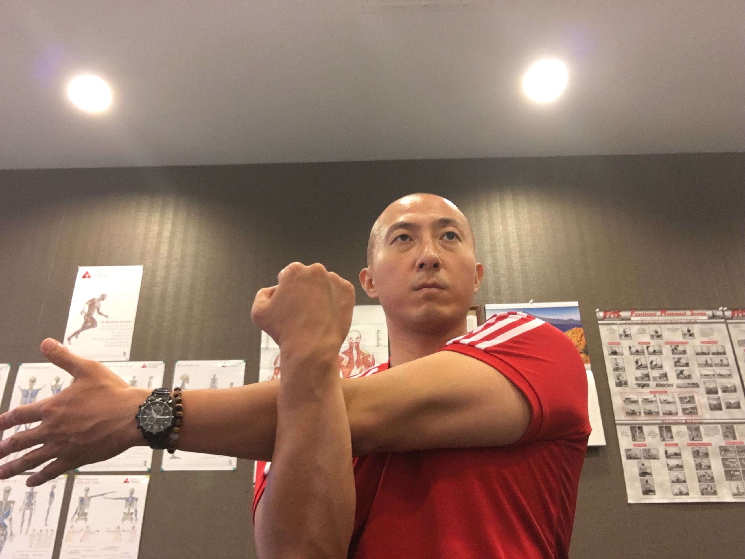 このテストで左右差、極端に腕と腕が離れている場合はこれが改善できるようにエクササイズのプログラムを組み立てます。