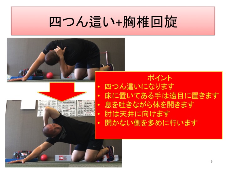 今回のケースでは胸椎の可動性が低下してのが原因で腰痛・骨盤の安定性が低下したと評価させていただので、胸椎の動きが沢山出る運動を行っていただきました。その結果、帰る際には腰痛が感じなくなりました。運動の一例として写真のご参照ください。