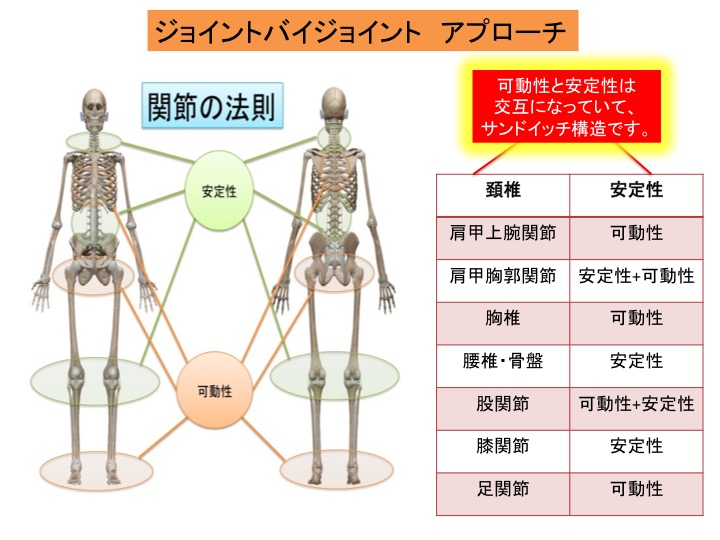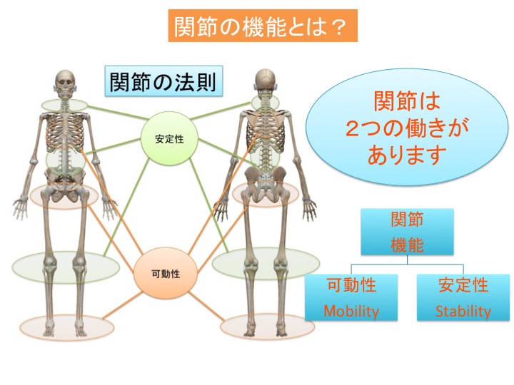 この法則は本来、可動性である関節が可動性の低下により、その上下に隣接している関節も役割が変わってしまい、パフオーマンスの低下や怪我のリスクが増えてしまうというものであります。