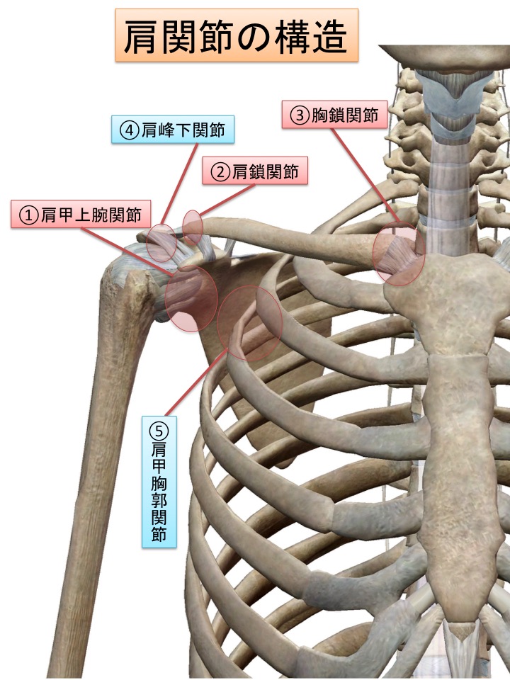 この5つの肩関節を構成している骨は胸骨、鎖骨、肩甲骨、肋骨、上腕骨になります。