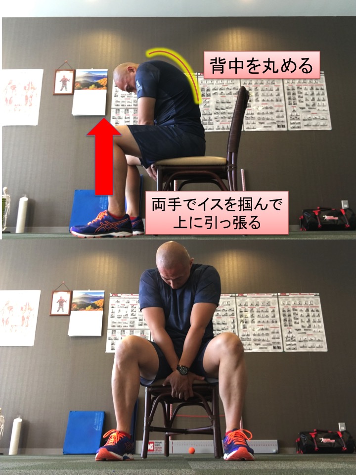 肩甲骨が挙上したまま腕をあげる動作を行うと腱板損傷など障害リスクになるので、挙上していると思われる場合は写真のようなストレッチがお勧めです。