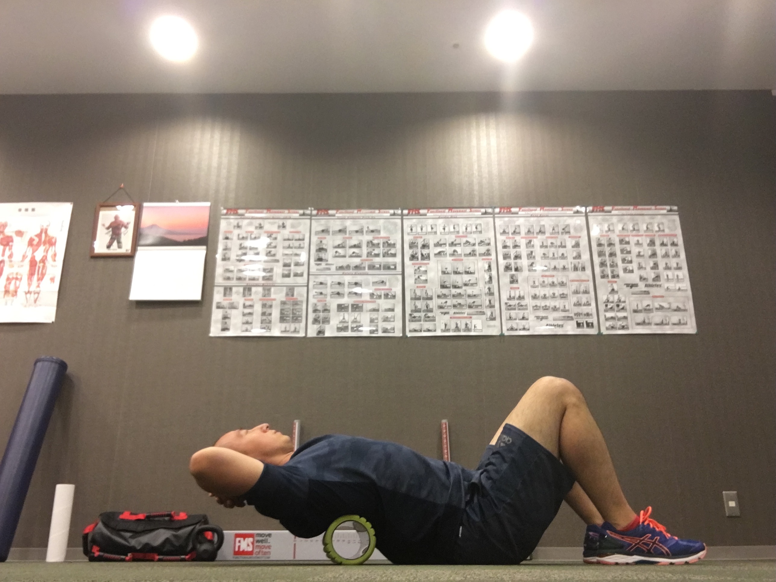 この肩を180度屈曲した状態を維持しながら、スクワットをするスクリーニングがあるのですが、動作中に180度キープできない方の特徴として、背中が丸まってしまいます。