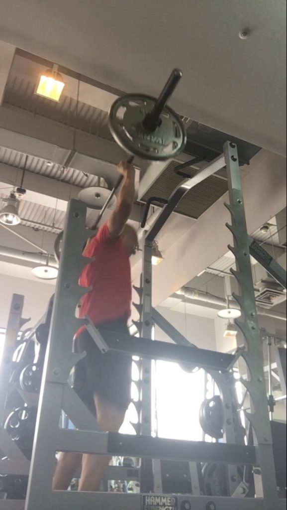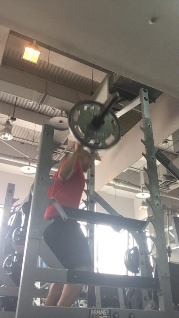 2種目目は反動を使いながらバーベルを真上に上げていく種目です。