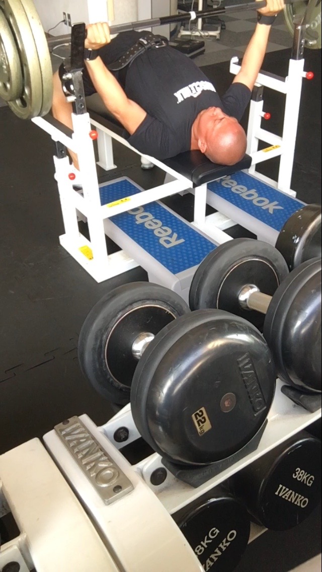 身体を安定させて重りを挙げていくことが大切なので、ベンチ台からいかに身体を前後に移動させずに、動作を行えるかを課題にしております。