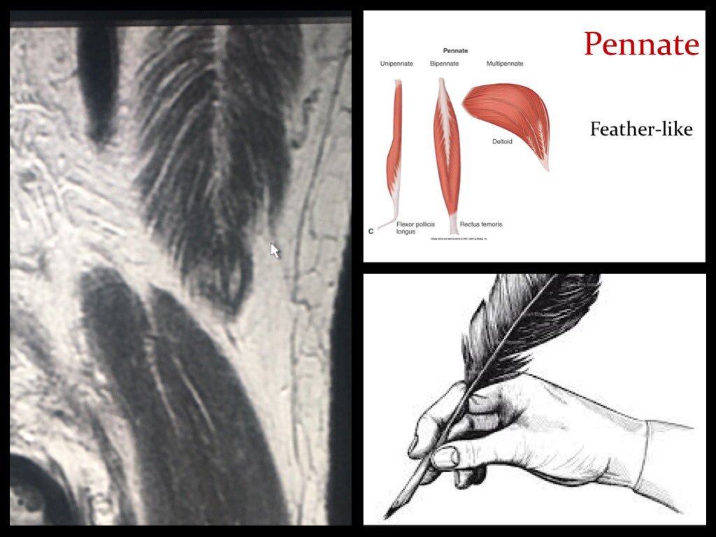 紡錘状筋(ぼうすいじょうきん)は両サイドに腱が付いているのがほとんどですが、羽状筋(うじょうきん)は中心にある腱に向かって筋線維が斜めについていたり、腱が筋肉と同じ長さになっているという特徴があります。