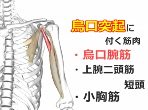 実はこの小胸筋という筋肉は体の前側にあるのですが、肩甲骨の上の方「烏口突起(うこうとっき)」という場所についていて、筋肉が縮こまると肩甲骨を前側に傾かせてしまいます。