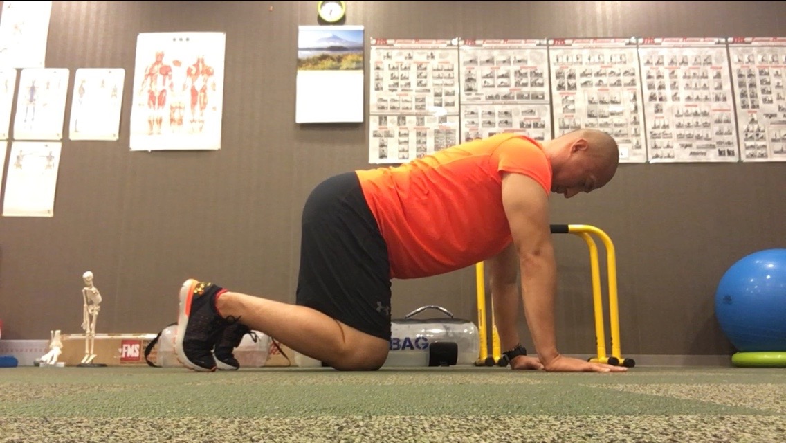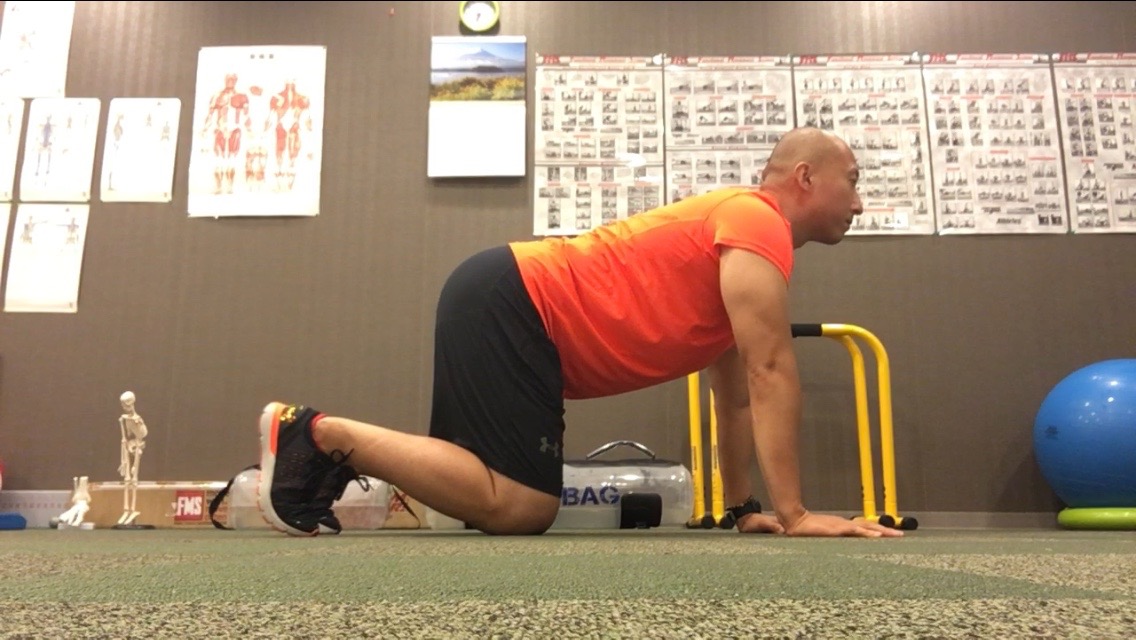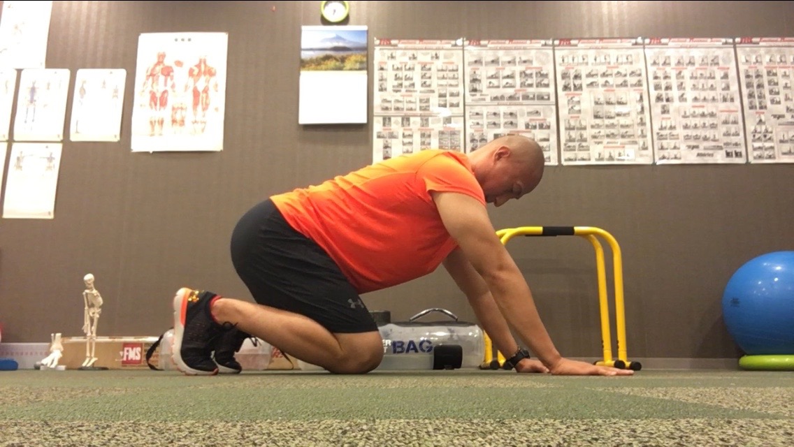 これを修正するための第一歩のエクササイズとして、写真のように四つんばいになり、お尻をかかと側に後方移動させて、元の姿勢に戻すということを繰り返していきましょう。