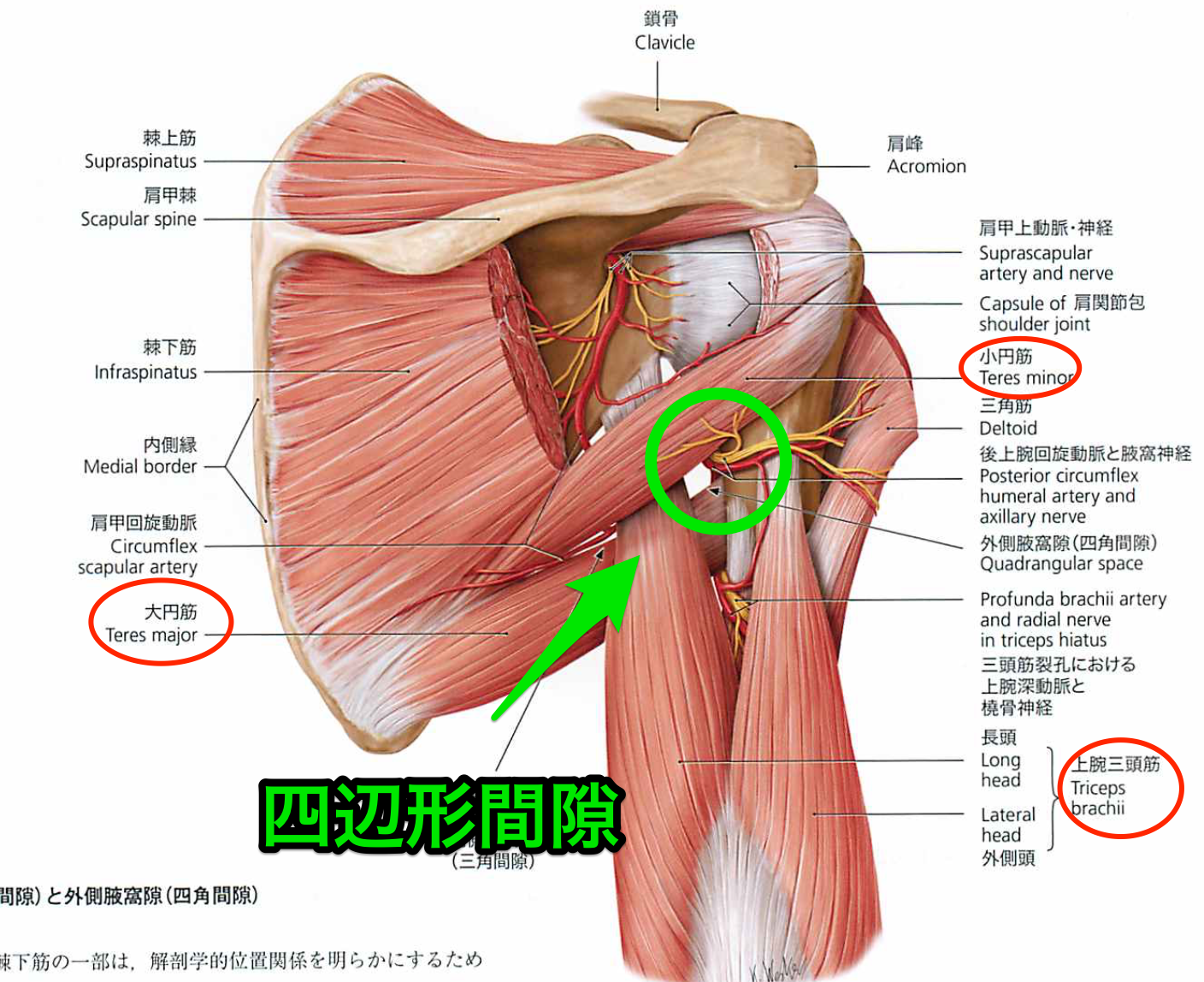 身体の後ろ側で脇に近い部分に上に小円筋、下に大円筋、内側に上腕三頭筋長頭、外側に上腕骨(右腕)で構成されている四角腔があり、この四角腔の間に腋窩神経が通っています。