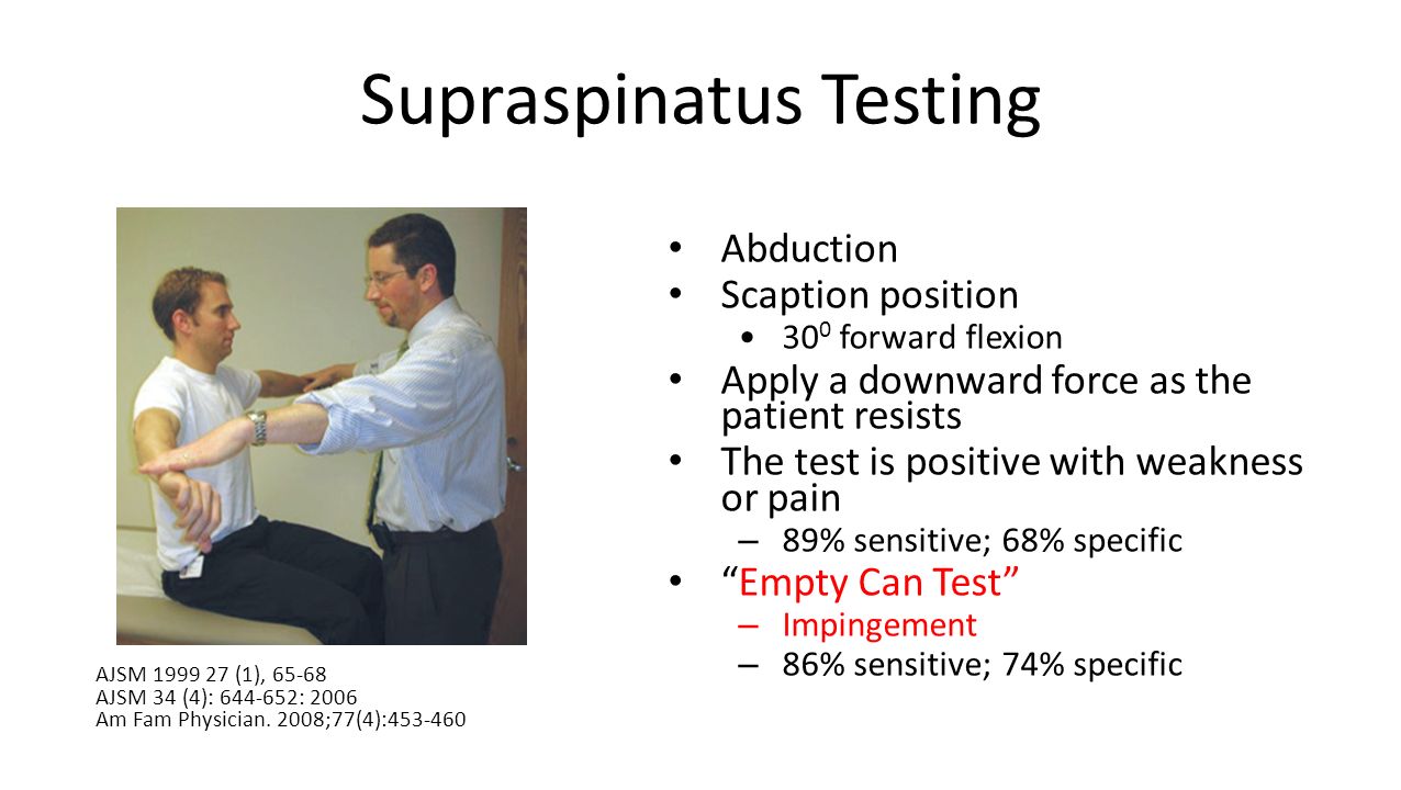 Abduction. Scaption position. 300 forward flexion. Apply a downward force as the patient resists. The test is positive with weakness or pain. 89% sensitive; 68% specific. Empty Can Test Impingement. 86% sensitive; 74% specific. Stevenson, JH and Trojian, T. Evaluation of shoulder pain. JFP July (7) Itoi, E, et al. Which is more useful, the full can test or the empty can test in detecting the torn supraspinatus tendon? AJSM (1), Thigpen, CA, et al. Scapular kinematics during supraspinatus rehabilitation exercise: a comparison of full can versus empty can techniques. AJSM 34 (4): : AJSM (1), AJSM 34 (4): : Am Fam Physician. 2008;77(4):