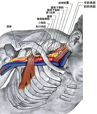 1箇所目は前斜角筋と中斜角筋、第1肋骨で構成されている斜角筋隙と呼ばれているトンネルが筋肉の緊張によりトンネルが狭くなり、腕神経叢の挟み込みが起きます。このような症状を斜角筋症候群と呼びます。