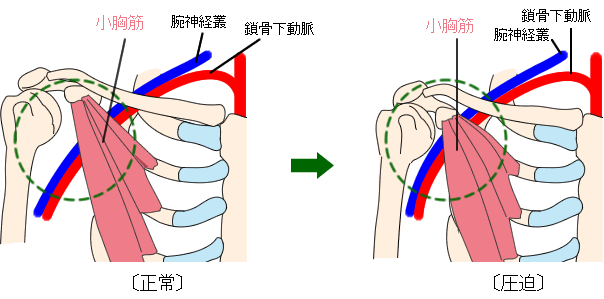 小胸筋は大胸筋の奥にある筋肉ですが、更に奥を覗いてみると腕神経叢、鎖骨下動脈、鎖骨下静脈があります。そのため、トレーニングのやりすぎやデスクワークを多くやりすぎにより、小胸筋が硬くなりやすくなり、その状態で腕を上げたると小胸筋と烏口鎖骨靭帯の間にある腕神経叢と鎖骨下動脈・鎖骨下静脈が挟み込まれて牽引ストレスとなります。